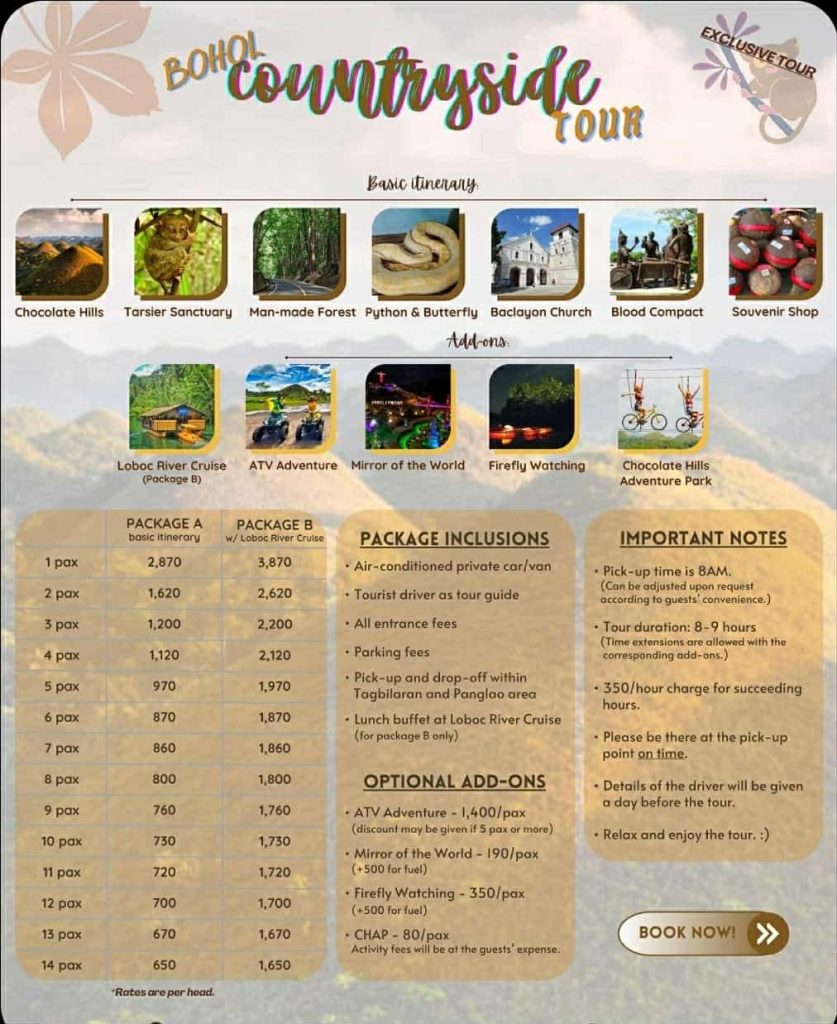 SAMPLE ITINERARY: (Customizable based on preferred location) 7:30 AM – Pick-up from Tagbilaran Port / Panglao Airport / Hotel